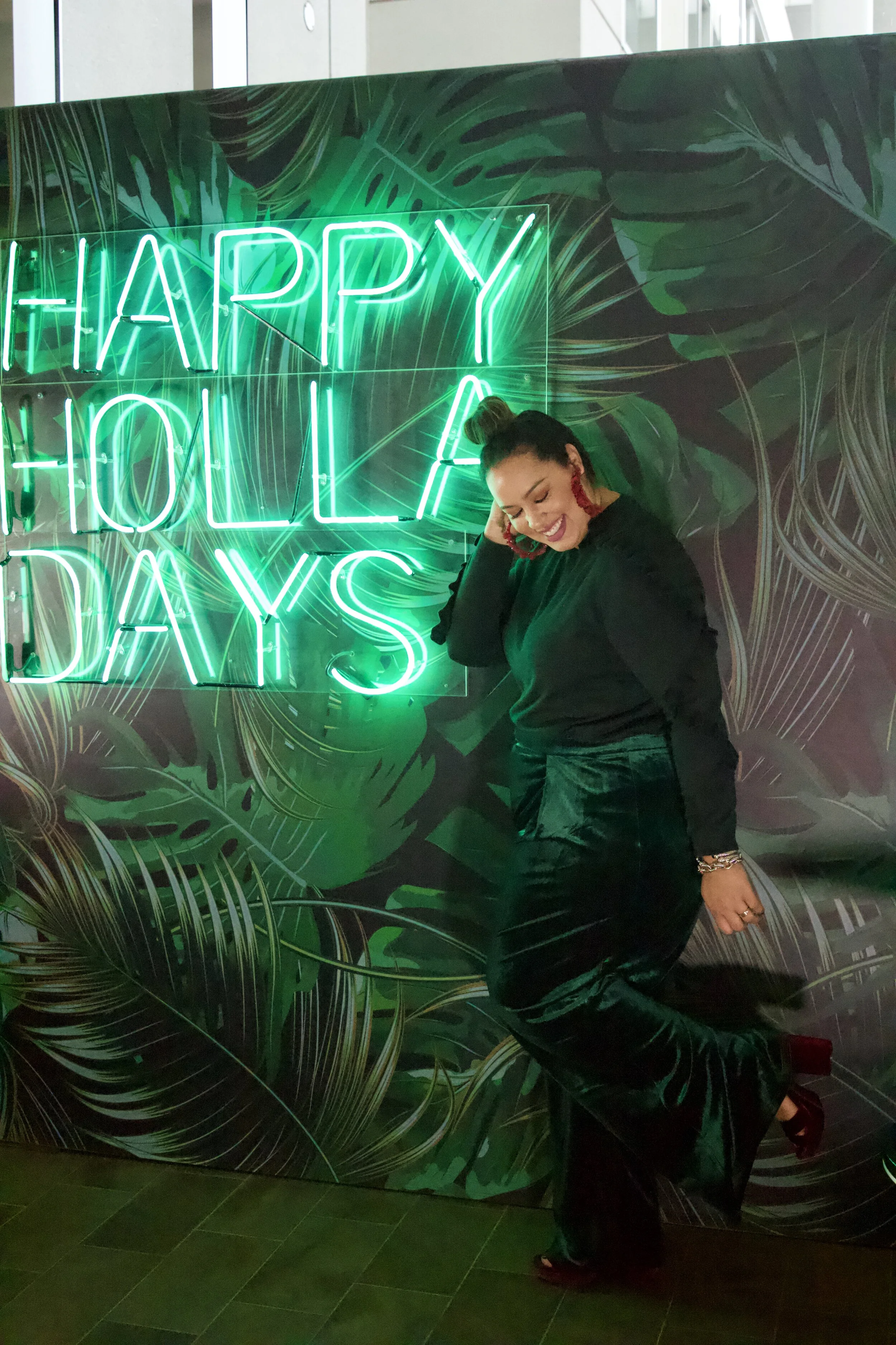 Hey Guys,I'm working in LA right now but in between fittings I got a chance to shoot a look that I've been waiting to shoot for weeks. Life has been super busy and crazy lately so I gotta use every opportunity I have to create content that I love for you guys.Sadly I waited so long to post this look that both the pants and top are sold out! Then again I share my looks so you can be inspired not just so you can run out and by them (although that's fun too)!This little Holladay install is at the W Hotel in Hollywood is so chic and cute. I knew it would be the perfect little corner for the monochromatic look. I need this neon sign for my house, right?Back to my look. I added accessories in a rich burgundy. It's so holiday and adds a little punch to the look.I'm headed back to work but hope you guys like this little Holladay look!