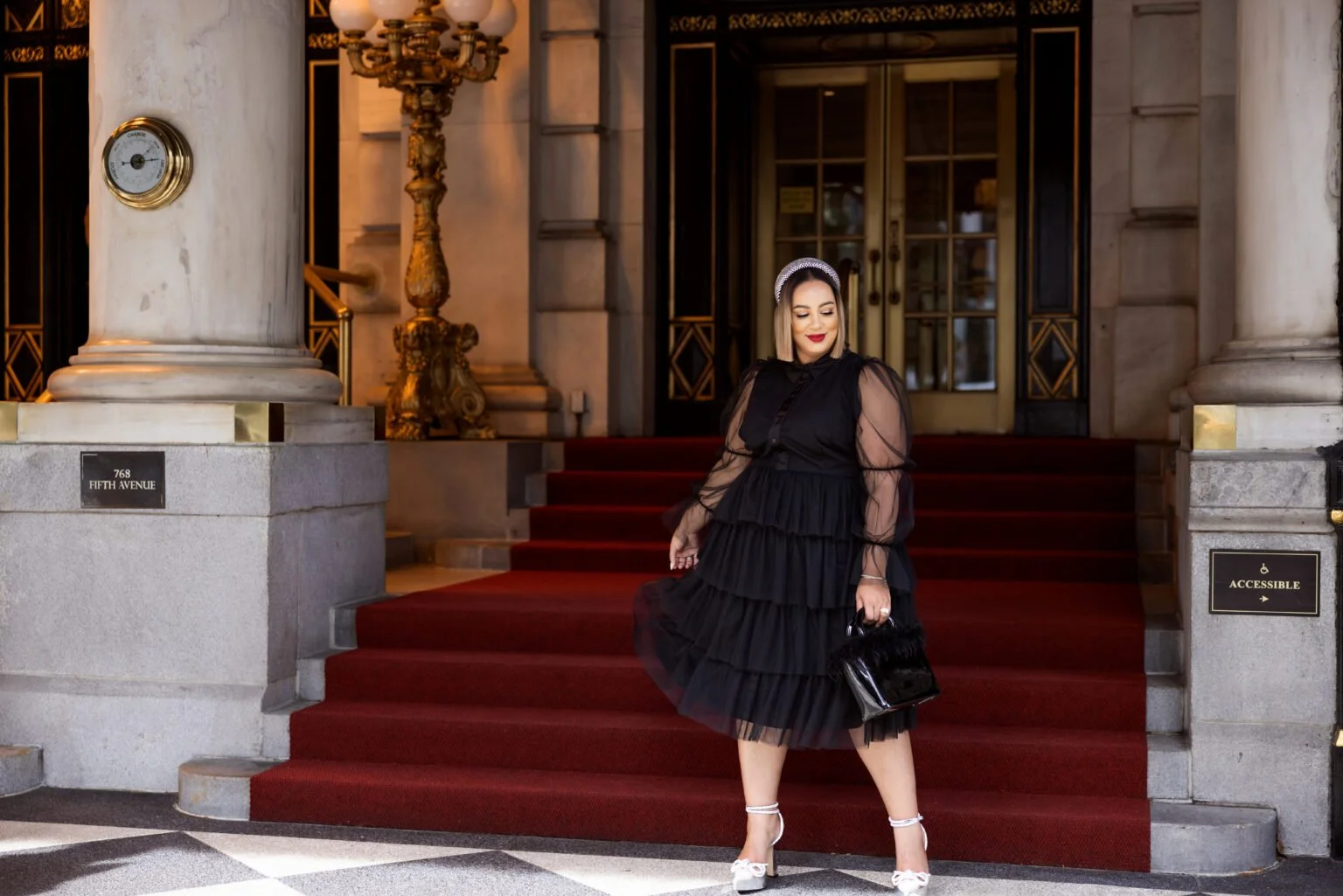 The Evan Dress – My daughter Evan loves a good dress. She literally changes from her school clothes into a dress. So you know I had to come with it or else she wouldn’t approve. This black tiered tulle dress is both timeless and trendy. The sheer sleeves and tiered style skirt add a playful feminine touch while the collar and front buttons maintain the tailored vibe. You can pair with heels for a classic dressy look or you can pair with chunky boots and tights for a cute city chic look. Shop Dress HERE