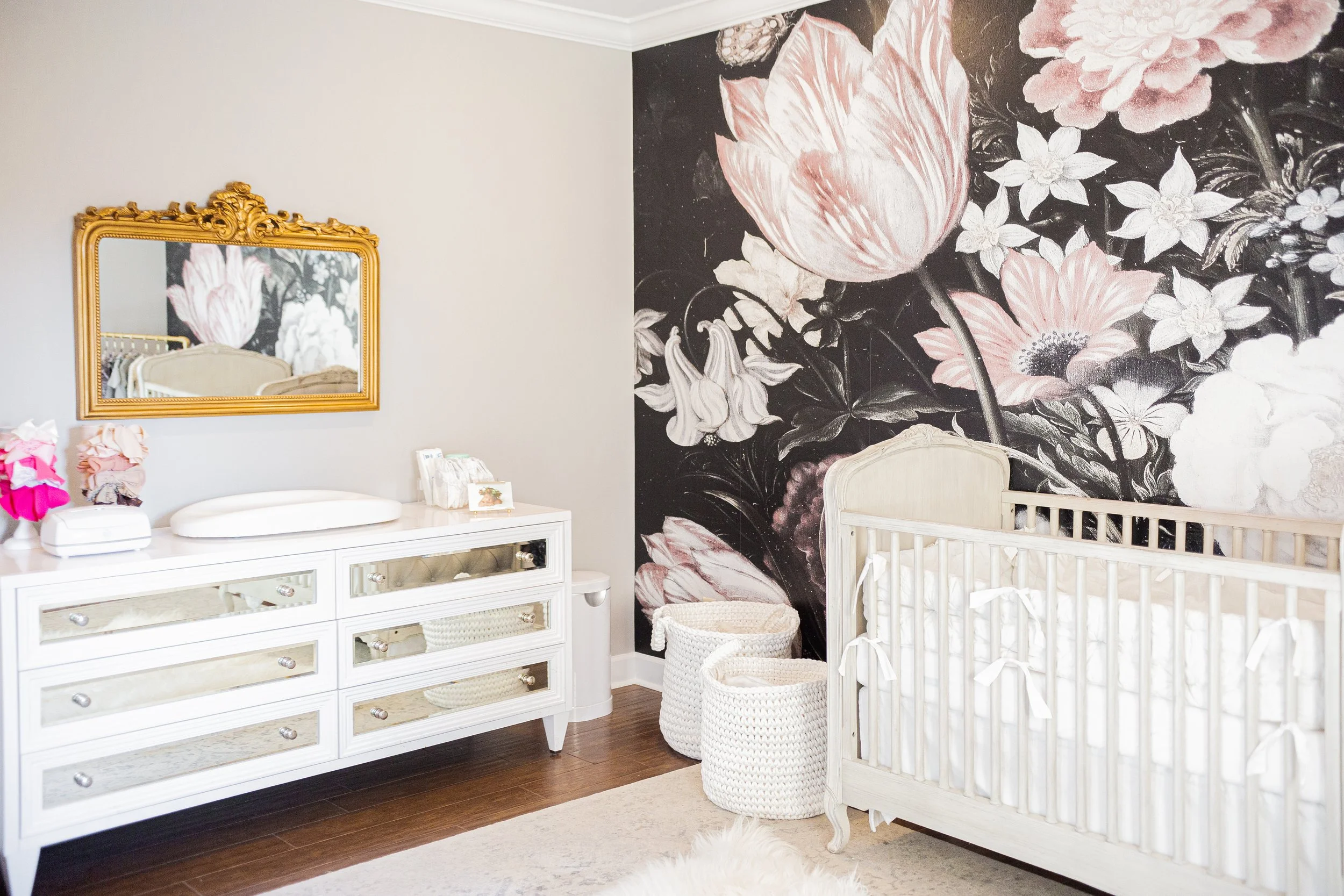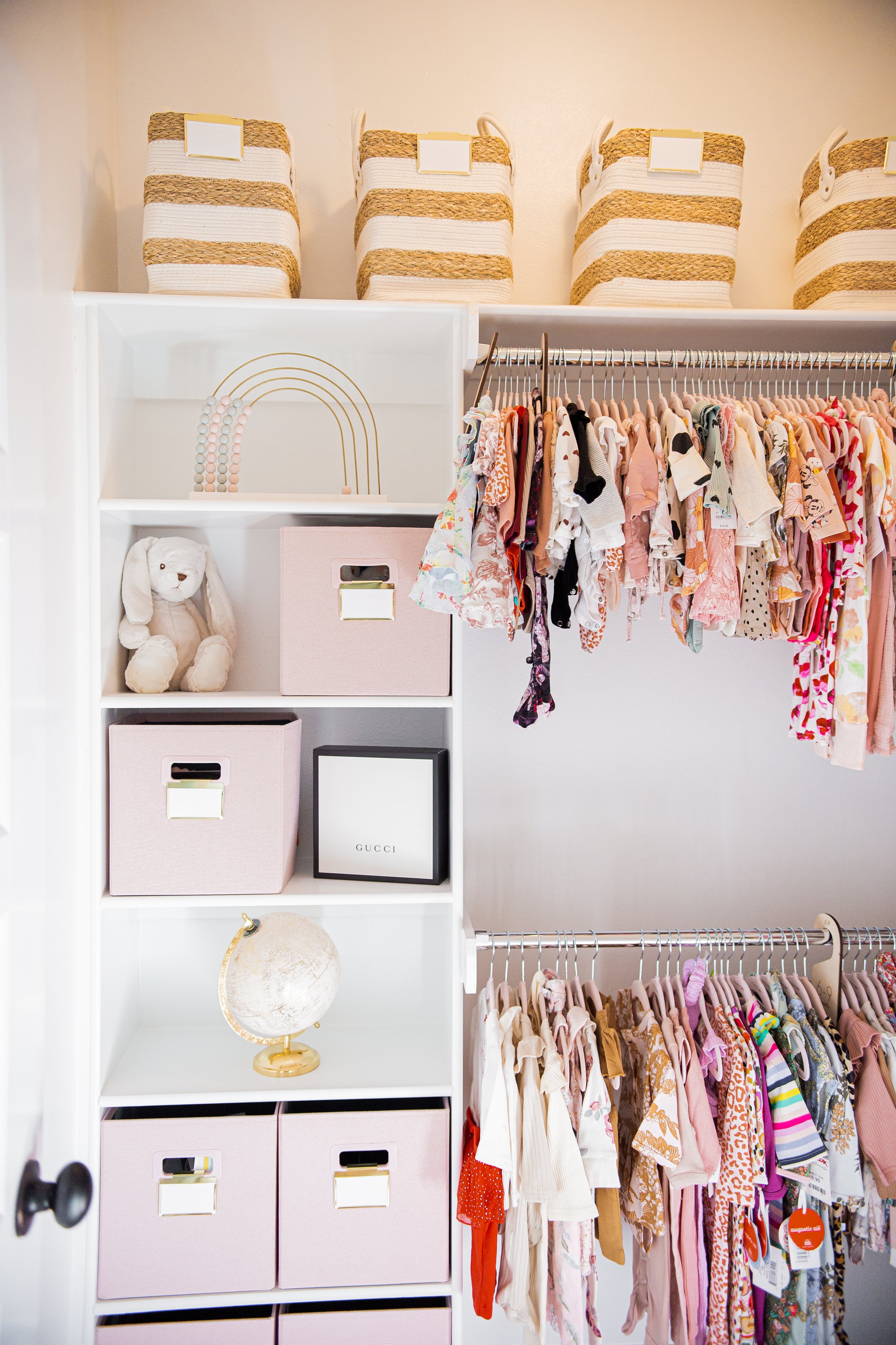 dresser mirror / crib / wallpaper / clothing rack / rug / sheepskin rug / rocking chair / Acrylic bookshelves / Bookshelf / acrylic display box / pink velvet hangers / size dividers / baskets / gold bin labels / hat boxes / pink storage cubes / pink storage bench / Sheep storage cube