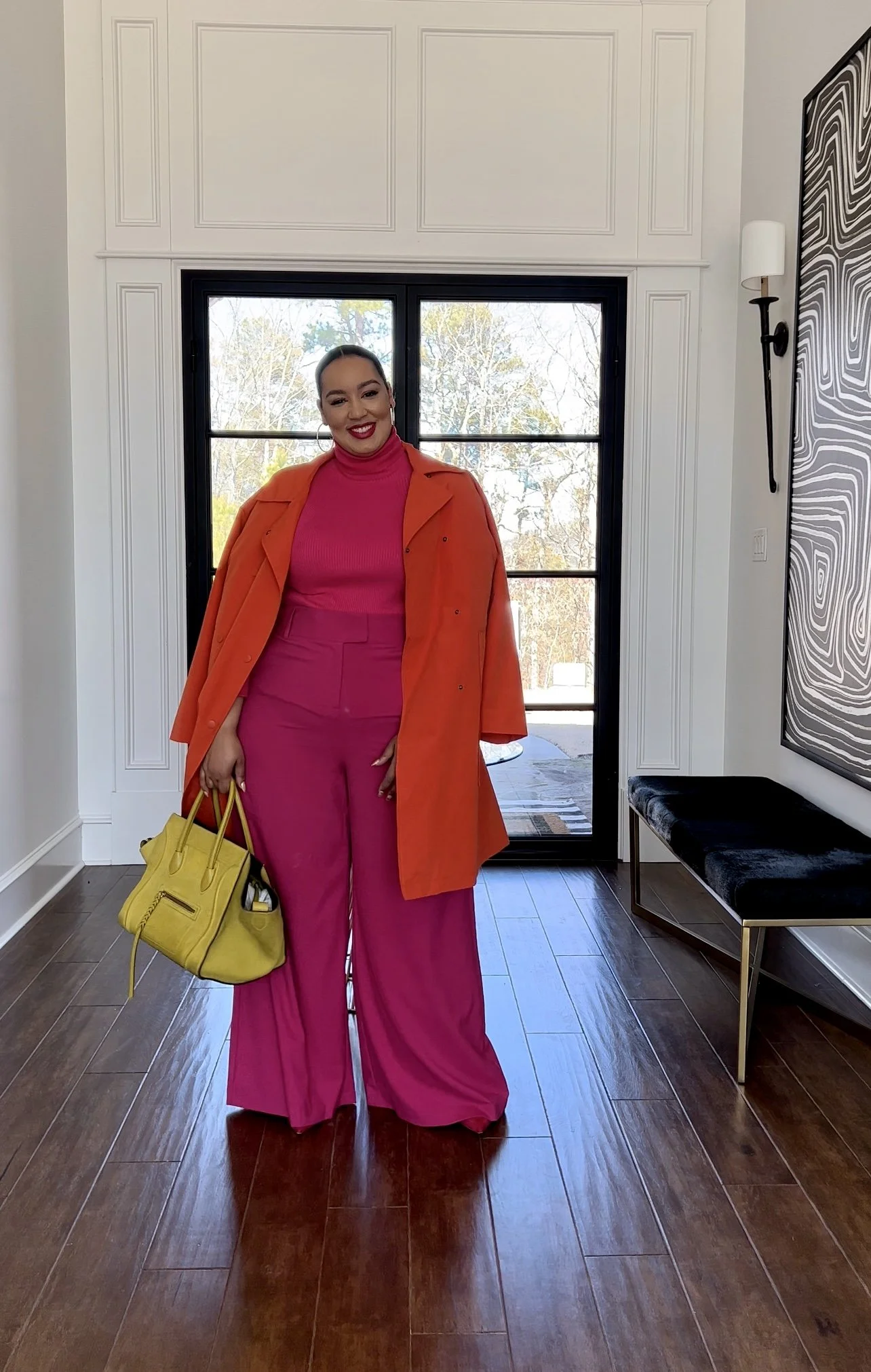 A fan favorite style pairing is color blocking. This is the type of look that separates the sheep from the lions. This fierce pink flare pant, soft pink turtleneck and pink heel scream confidence without you ever saying a word.